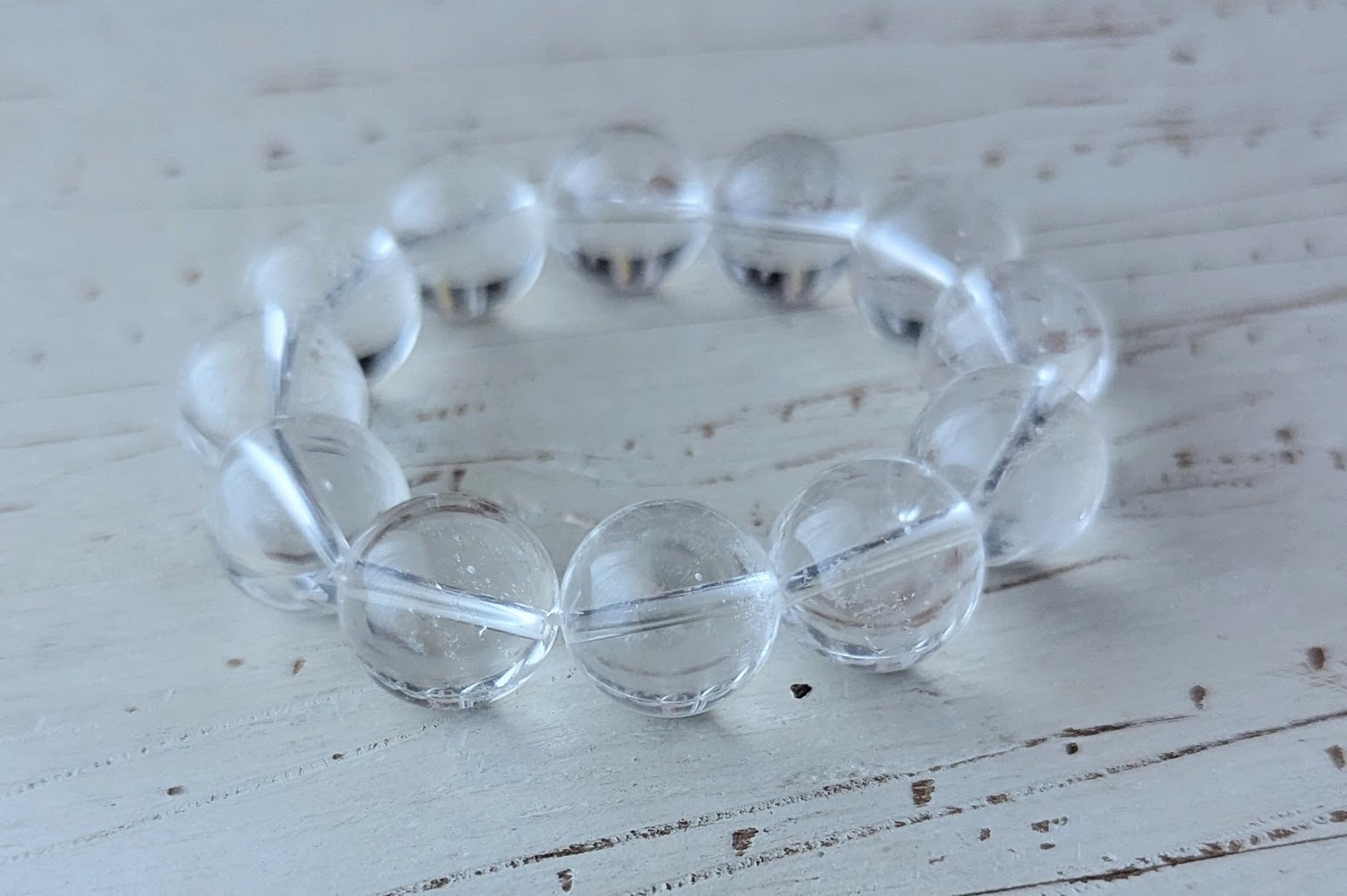 この大粒の水晶ブレスレットは、光り輝く美しさが特徴です。