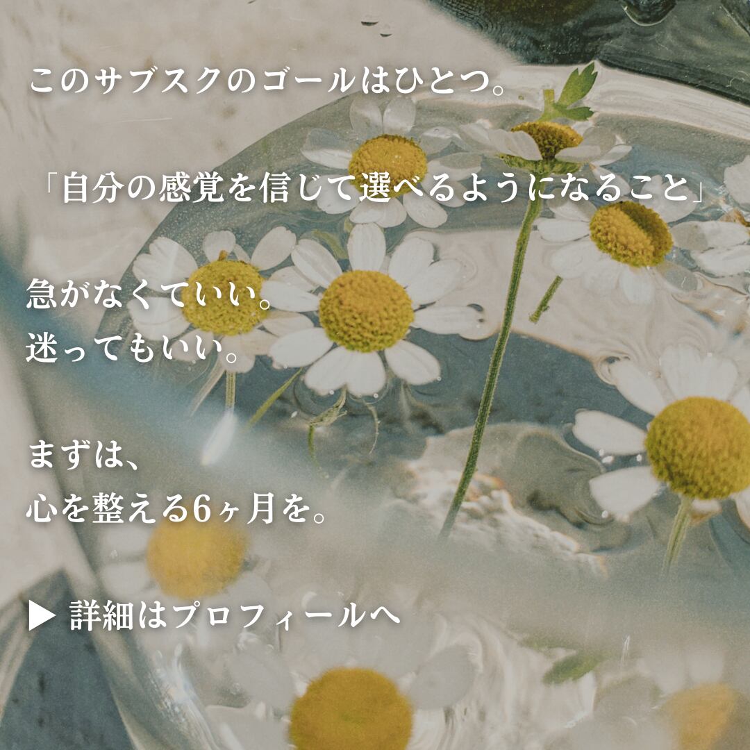 感覚を信じて選べるようになる。 そのための、静かな6ヶ月間。 焦らなくていい。迷っても大丈夫。 まずは、心の奥の声とつながることから始めよう。