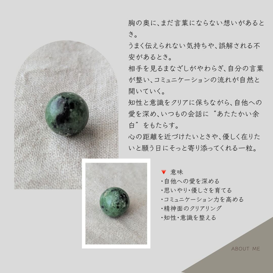 特徴:落ち着いたグリーンが印象的で、心を静かに整えるような雰囲気の粒です。