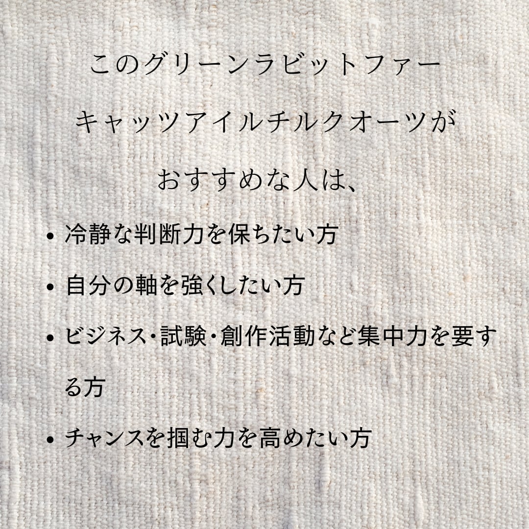 「静かな集中、揺るがぬ軸をもつ石」 ―― 穏やかであっても、芯は決して揺るがない。 グリーンラビットファーキャッツアイルチルクオーツ 粒売り